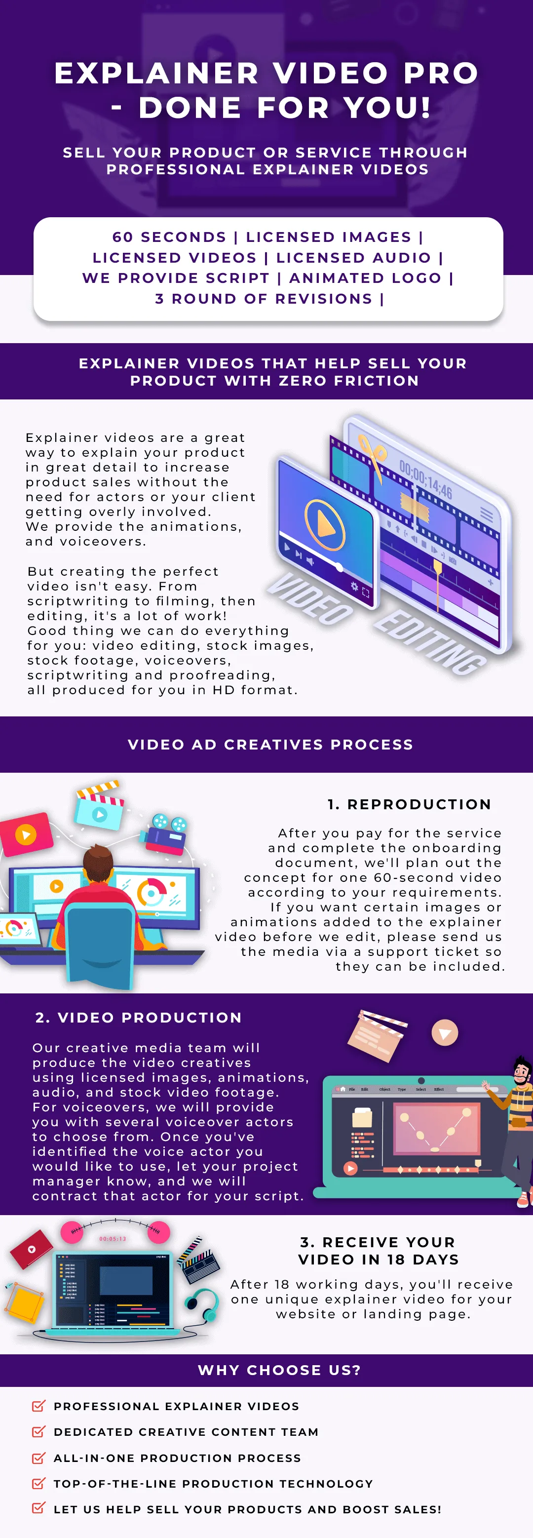 Help sell your product or service through a professionally edited explainer video. Perfect for websites and landing pages.