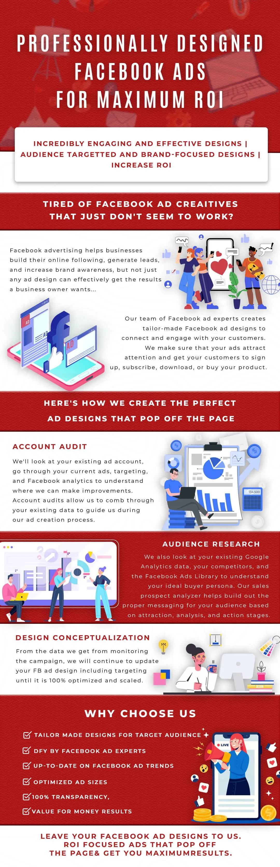 After you pay for this service and complete the onboarding document, we will start designing your new Facebook ad creatives. All design files are sent to you for your approval via email before zipping them up and sending you the RAWs. If you require any changes during our approval process, we can take care of them immediately and send you the revised copies. Your PM (Project Manager), will work with you to get approval.