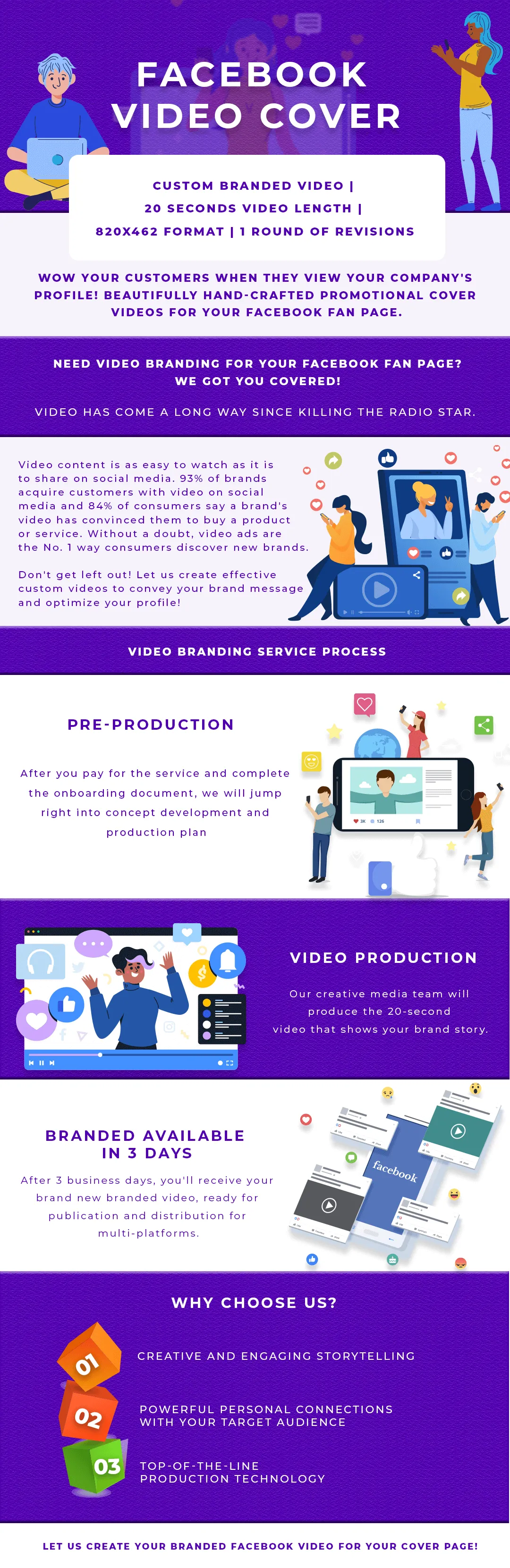 After you pay for this service and complete the onboarding document, your project manager will confirm receipt through a support ticket. Updates will be provided to you via support ticket 3 days later, with your new video. If approved, we will upload it to your Facebook page.