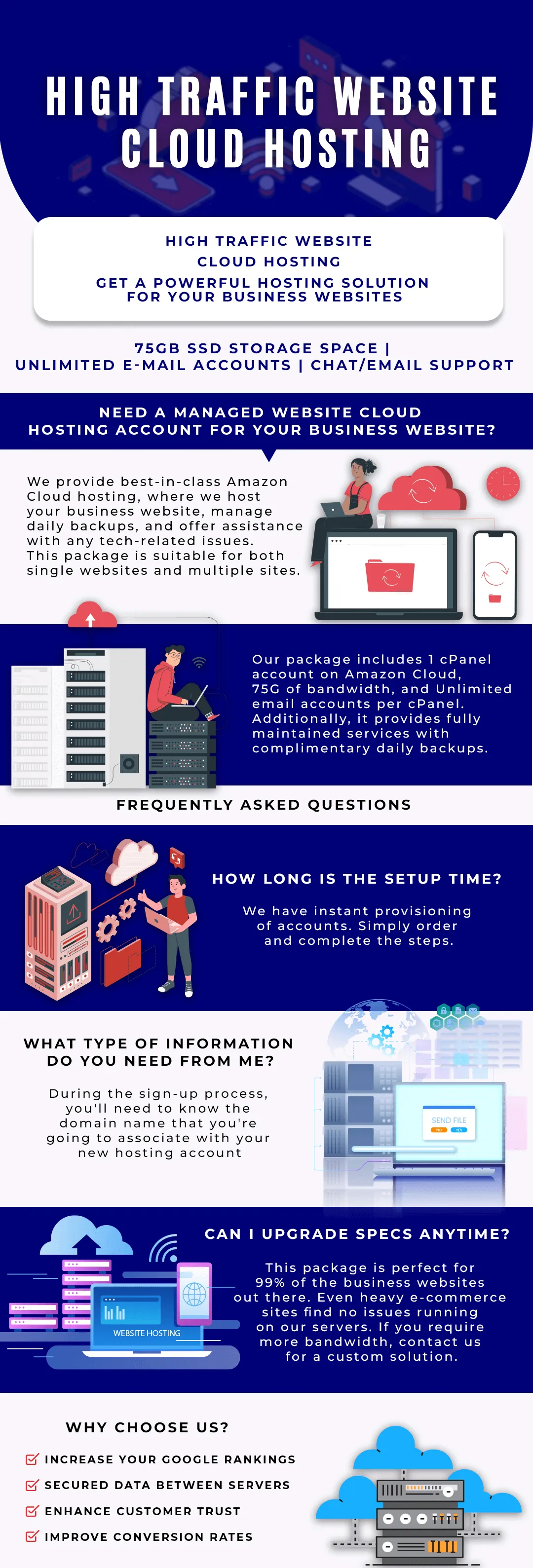 Best-in-class Amazon Cloud hosting. We host your business website, manage daily backups, and assist with any tech-related issues. This package is perfect for a single website or multiple.