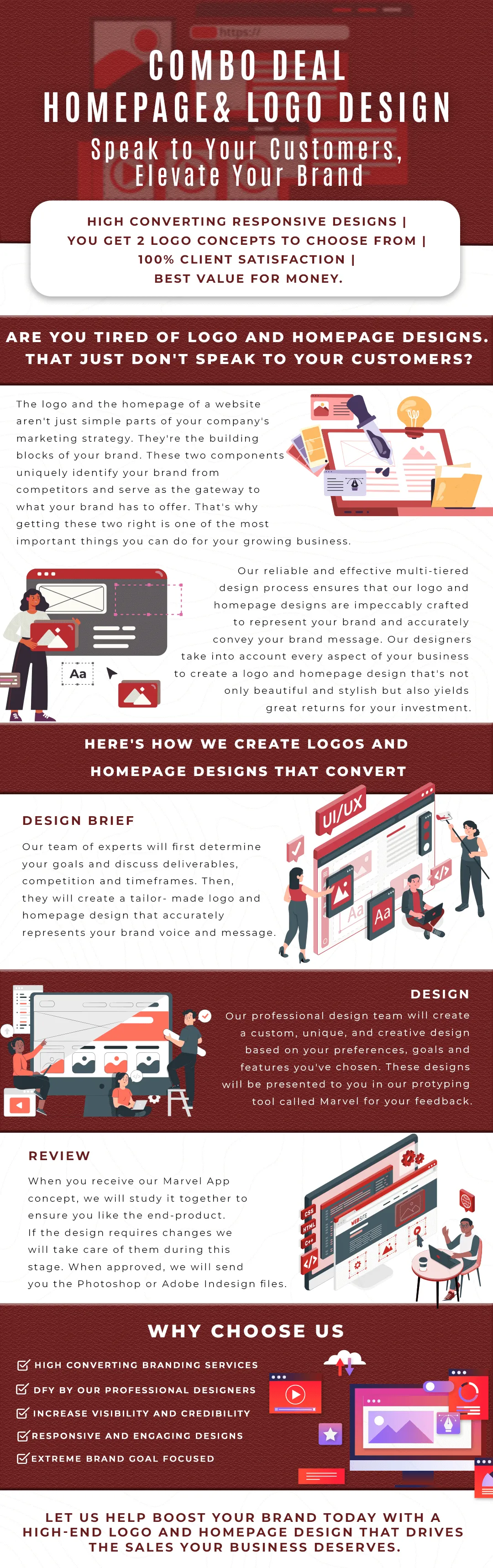 Is your client rebranding? Then this package is a " no brainer"; you get a professionally designed logo plus homepage design. This package also provides your agency with the flexibility to make money even if your client isn't "fully committed" with an A-Z website build. Also, this service is very useful if you're getting into a/b testing funnels or landing pages.