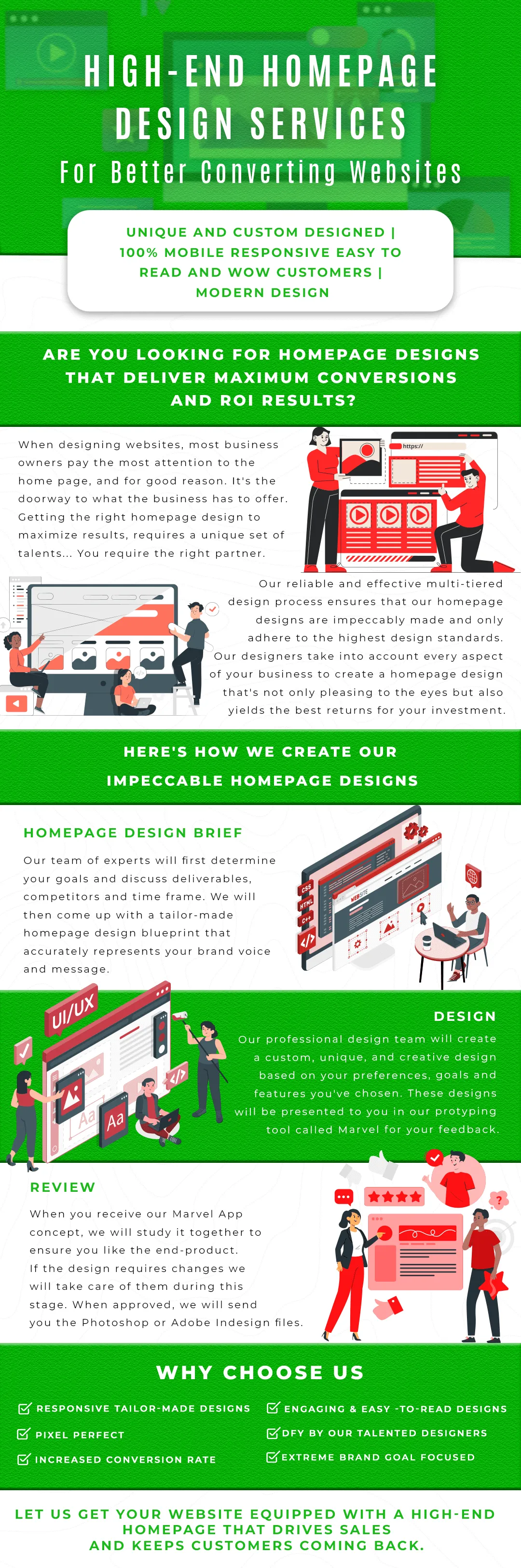 If your client doesn't have a business website, a homepage design is a good place to start. You can start working with our team to develop an accurate homepage blueprint. This is useful if you want to show your client what their new site would look like before it's even programmed; how cool is that? For marketers who work with many landing pages, this service will help give you pixel-perfect high-converting design that you can implement in your funnels right away.