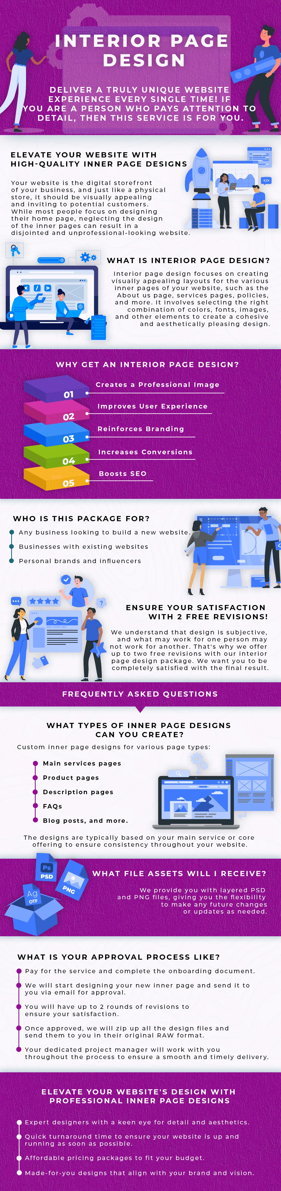 After you pay for this service and complete the onboarding document, we will start designing your new inner page. All design files are sent to you for your approval via email before zipping them up and sending you the RAWs. If you require any changes during our approval process, we can take care of them immediately and send you the revised copies. Your PM (Project Manager), will work with you to get approval.