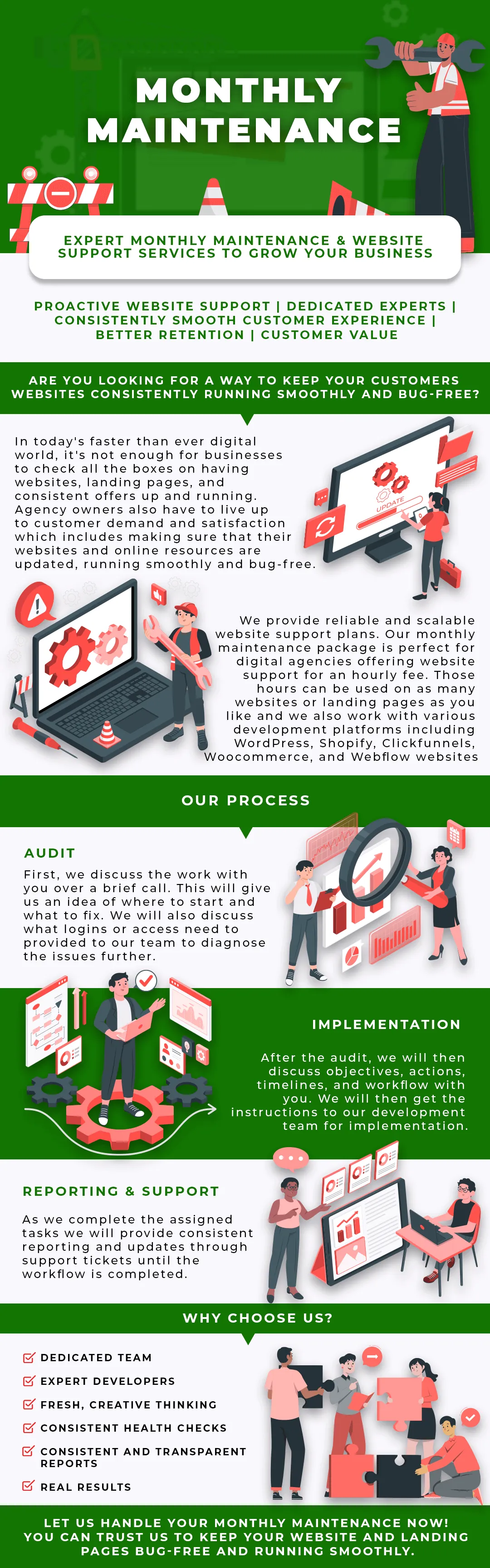 Our monthly maintenance support plans for websites include support for the following platforms: WordPress, GoHighLevel, Blitzen, ClickFunnels, Shopify, and Webflow.