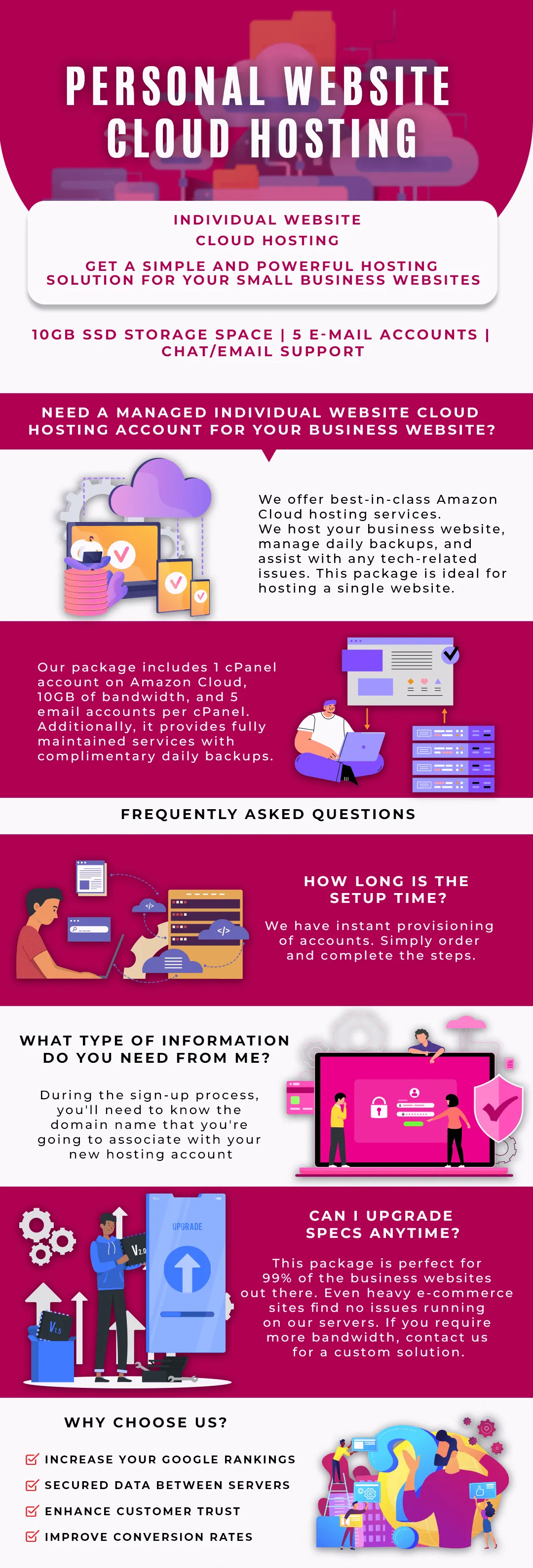 Best-in-class Amazon Cloud hosting. We host your business website, manage daily backups, and assist with any tech-related issues. This package is perfect for a single website or multiple.