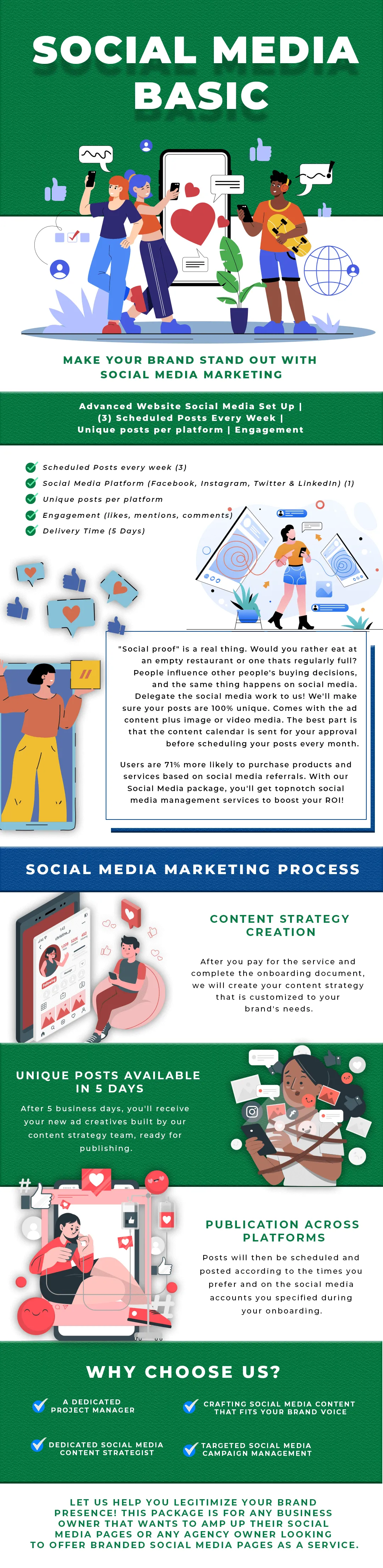 "Social proof" is a real thing. Would you rather eat at an empty restaurant or a regularly full restaurant? People influence other people's buying decisions, and the same thing happens on social media. Delegate the social media work to us! We'll make sure your posts are 100% unique. Comes with the ad content plus image or video media. The best part is that the content calendar is sent for your approval before scheduling your posts every month.