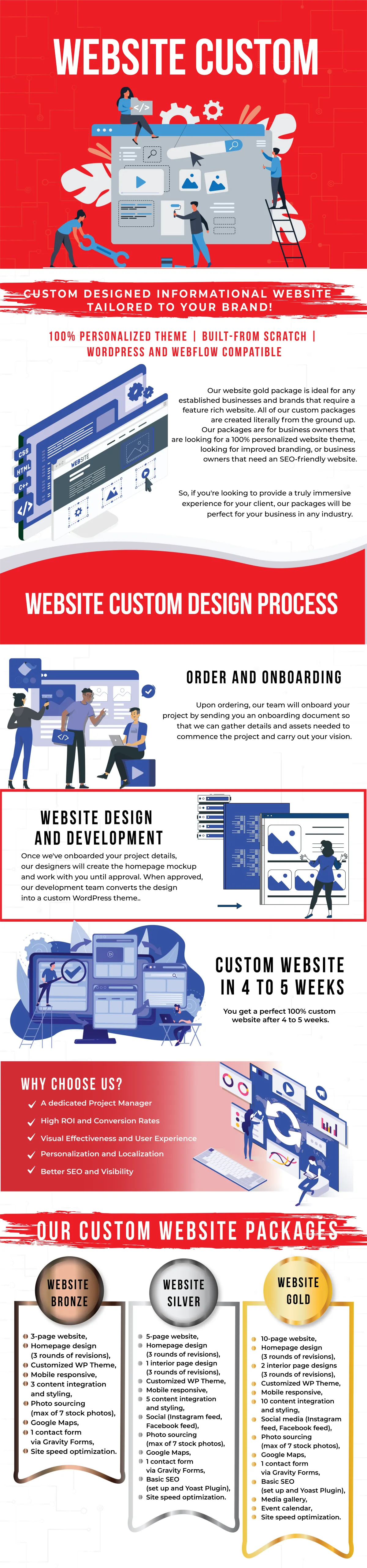 Our Gold Custom is a deal for any business that is getting into brand building. All of our custom packages are created literally from the ground up. Our designer, creates the homepage, then works creating all of the subpages. When approved, we have our development team converts the design into a WordPress or Webflow theme.
